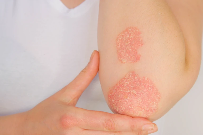 Doença inflamatória que causa placas avermelhadas e descamação. O tratamento controla as crises e melhora o aspecto da pele.